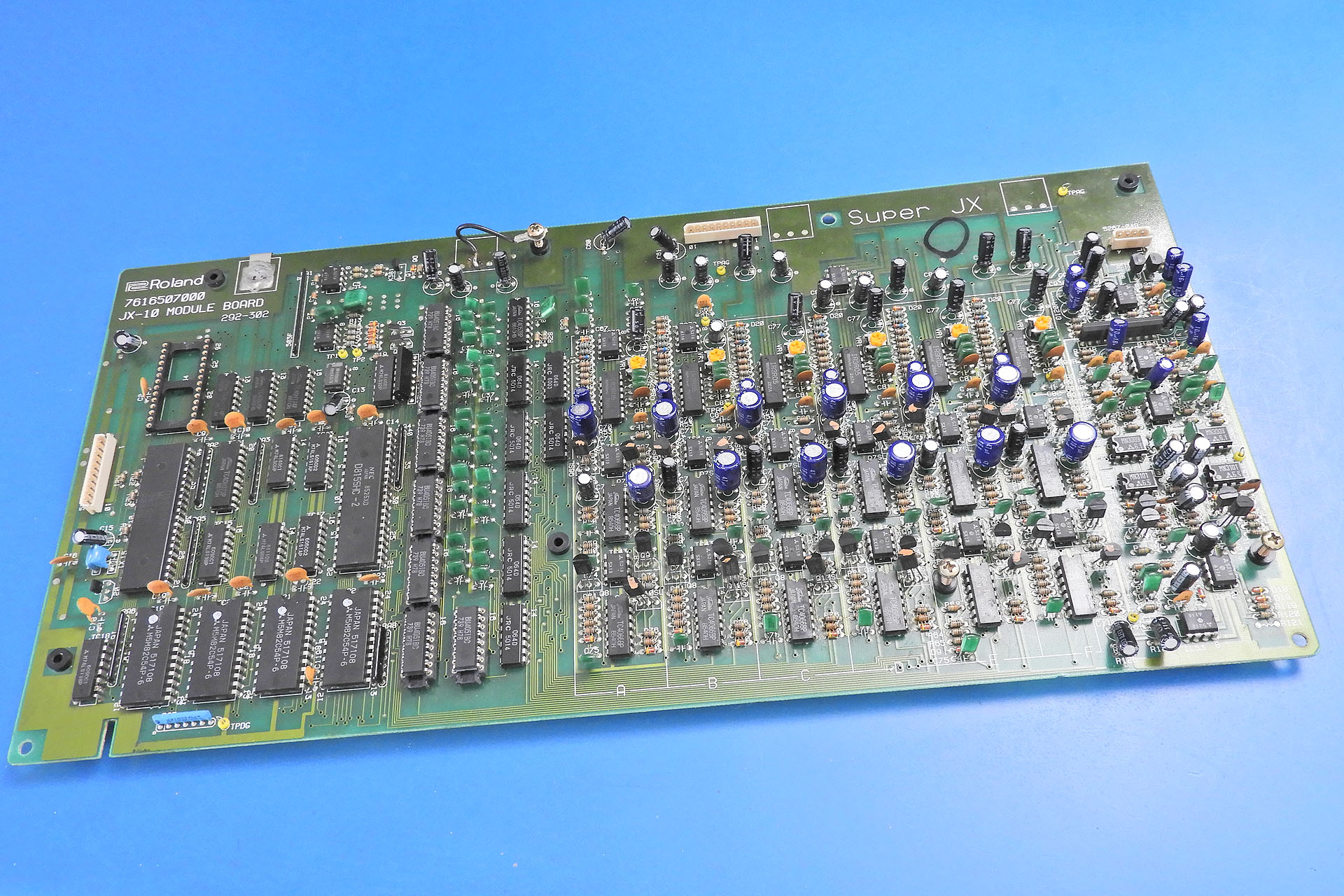 The JX-10 module-board just caught to the left of the picture above but fully shown below, has been sent from a local (UK) customer and has some serious audio issues.