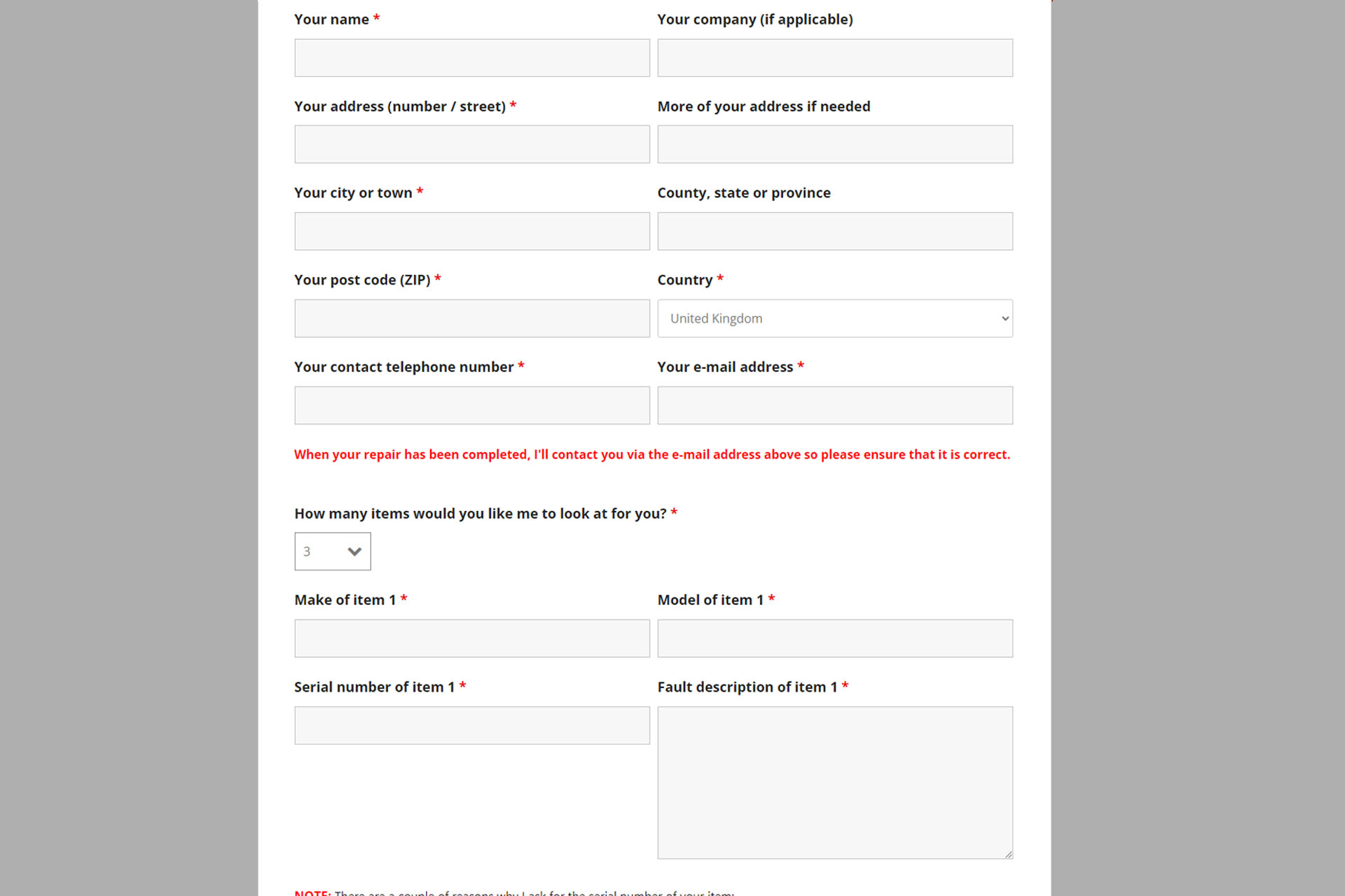 Well, last night, I redesigned my form and customers can now book in up to four repairs simultaneously. Details for each item need to be completed but customer contact details only need to be done once.