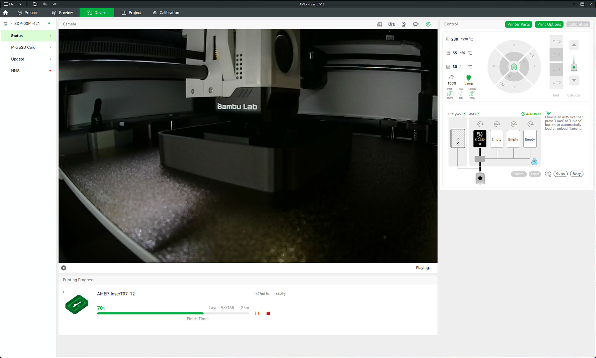 Eventually, we managed to print a couple of AMEP inserts in black PLA.
