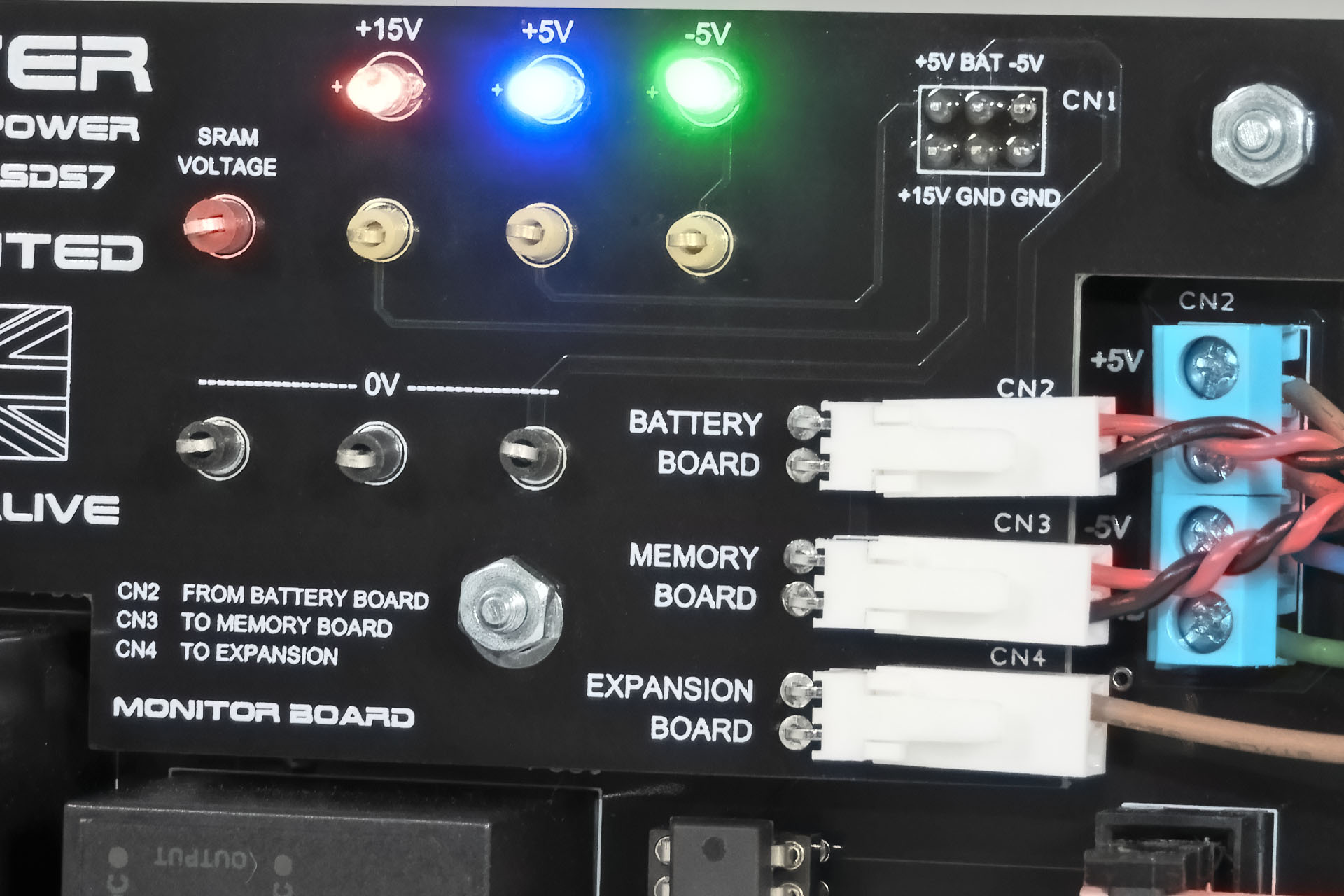 Situated on Dark Matter's monitor-board, are three status LEDs which confirm that a voltage is present on each of the three supplies. Just beneath the LEDs, are conveniently located test terminals so that the supply lines and indeed the SRAM voltage can be measured.