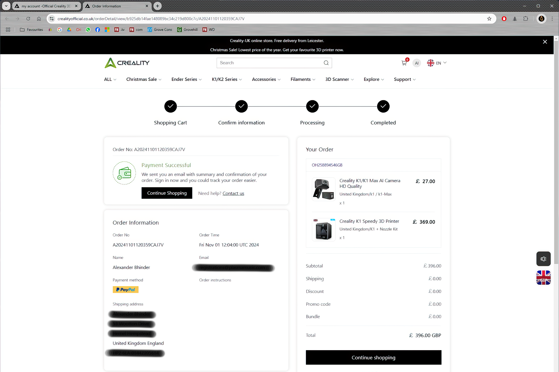 My Creality K1 cost me 369 GBP. I also bought a nozzle kit and a camera for an additional 27 GBP so I'm expecting 396 GBP back. I paid via PayPal and nothing has shown up in my account yet but to be fair, it's been less than twenty-four hours.