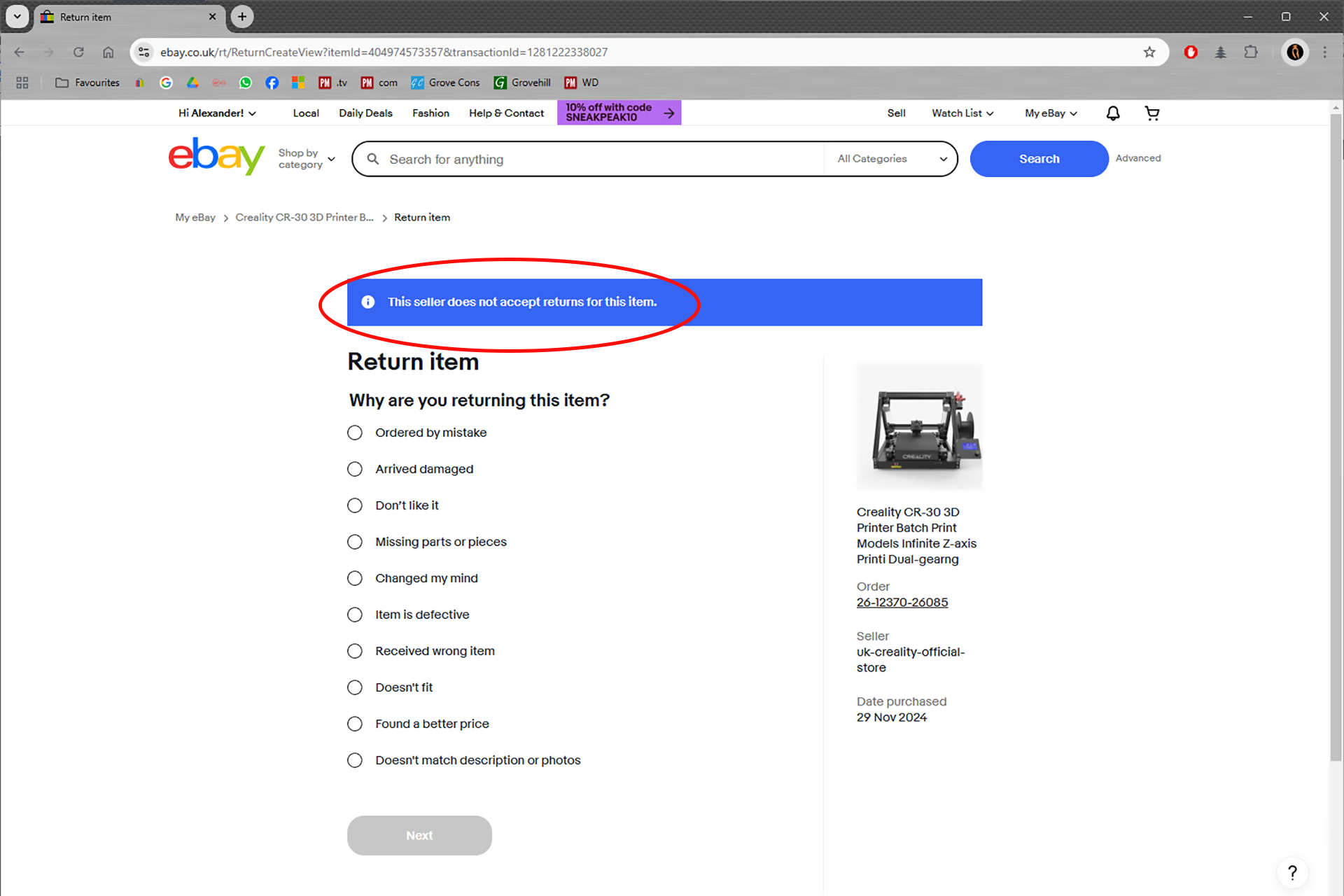 Regrettably and very disappointingly, PayPal was unable to assist with my purchases from the Creality website. I then went to return the CR-30. The relevant ebay page displayed the notice ‘This seller does not accept returns for this item’. Well, why should I be surprised? After a little digging, I sought some comfort in the fact that the sale was backed by ebay’s money back guarantee.