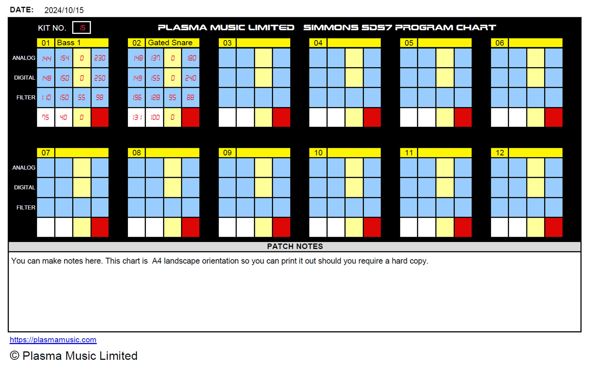 Programming the Simmons SDS7 is a laborious task and to get a collection of patches or kits, can take days, weeks or even months. Hey, it might be an idea if you had a record of all your hard work, right? Well, here's something to help you with that. My Simmons SDS7 program chart is an easy way to make sure that all your SDS7 patch data is safely recorded.
