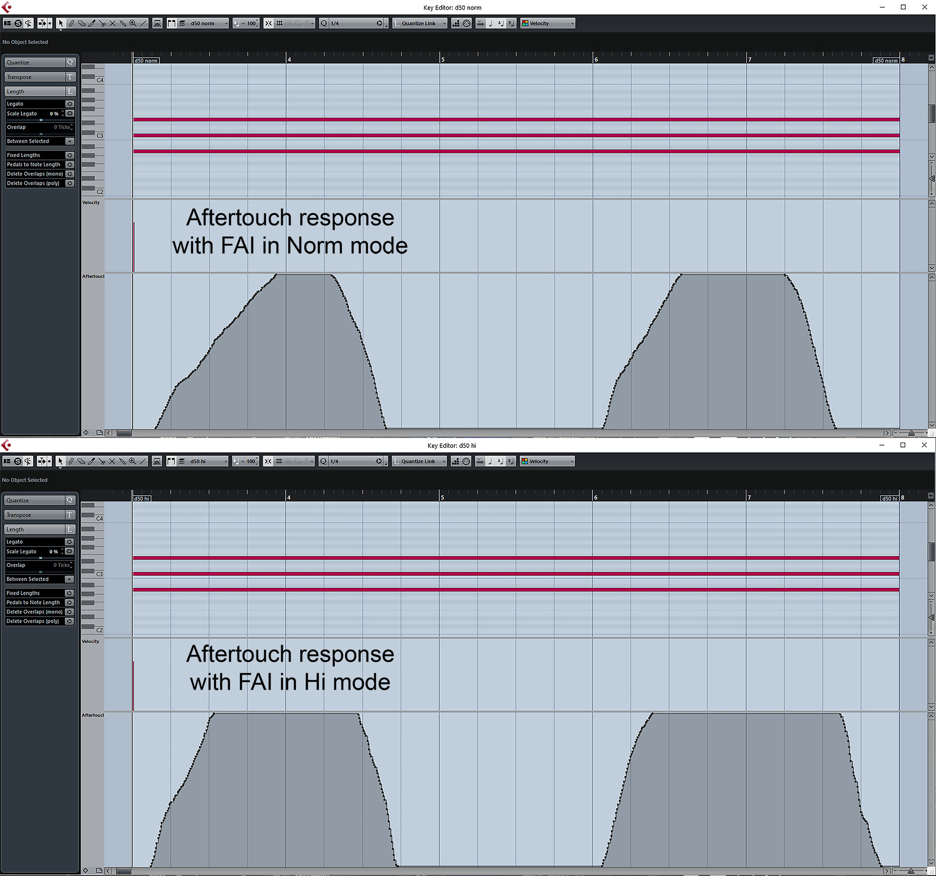 With the aftertouch fader on the D-50 set to about 80%, a MIDI velocity of about 90 and an average pressure, responses were recorded into Cubase with FAI in Norm and Hi modes. As you can see, a MIDI aftertouch value of 127 is reached in both modes. It's just that you get there quicker in hi mode.