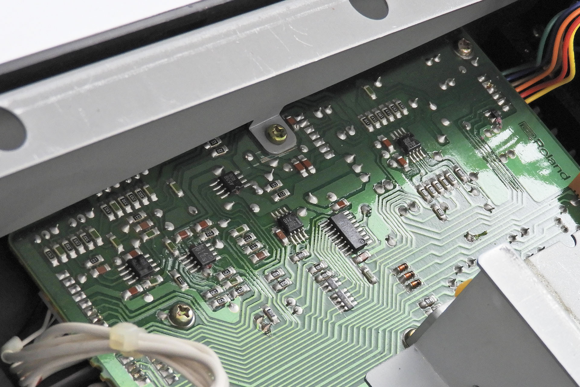 Remember I mentioned earlier that the D-50 has a lot of passive SMDs? Well one big bonus of adjusting aftertouch gain by varying the series resistor to the buffer op-amp, is that no components on the bender-board need to be replaced. In fact, the bender-board doesn't even need to be removed. All you need to do is solder a two wires to the bender-board.