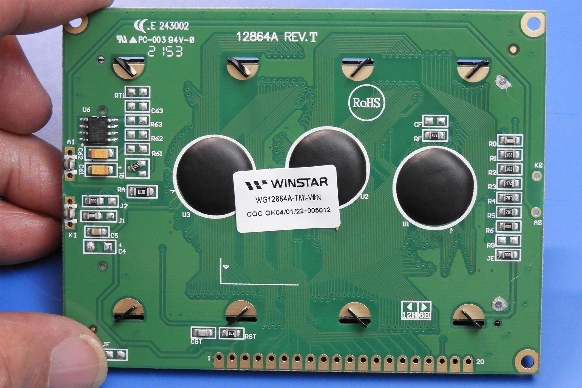 Once I had the original display disconnected, I could inspect the back and was relieved to discover that it was a bog-standard Winstar, specifically a WG12864A-RYH-VRB.
