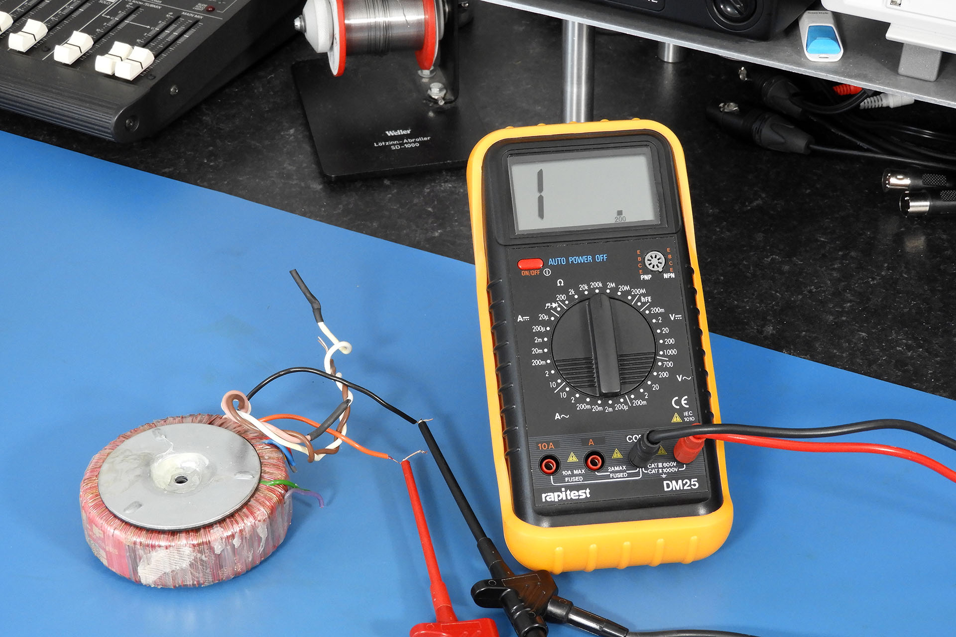 Between common and the 240V tap, this Simmons SDS7 mains transformer should read about 38Ω. As you can see, this is definitely not the case.