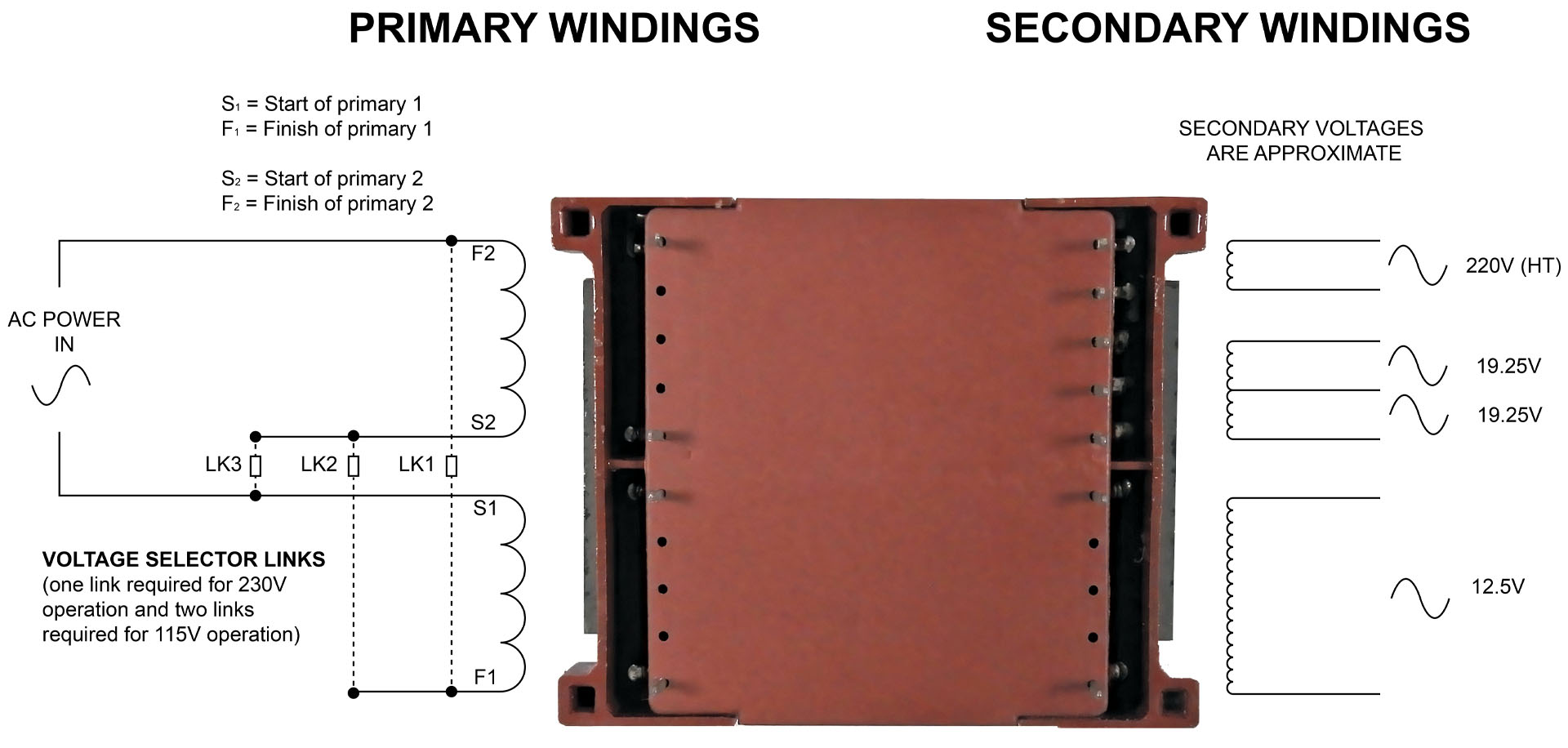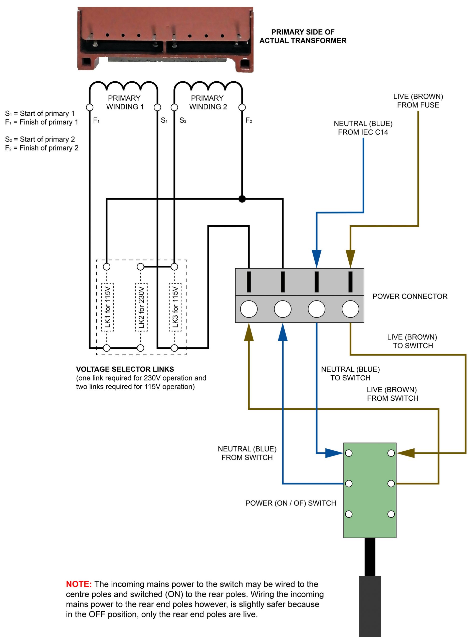 • EUOPEAN / UK VOLTAGE SELECTION. Wired in series, the primary becomes a single 230V winding which is suitable for 220V (Europe) and 240V (UK, Australia). To wire in series, connect ONLY LK2.