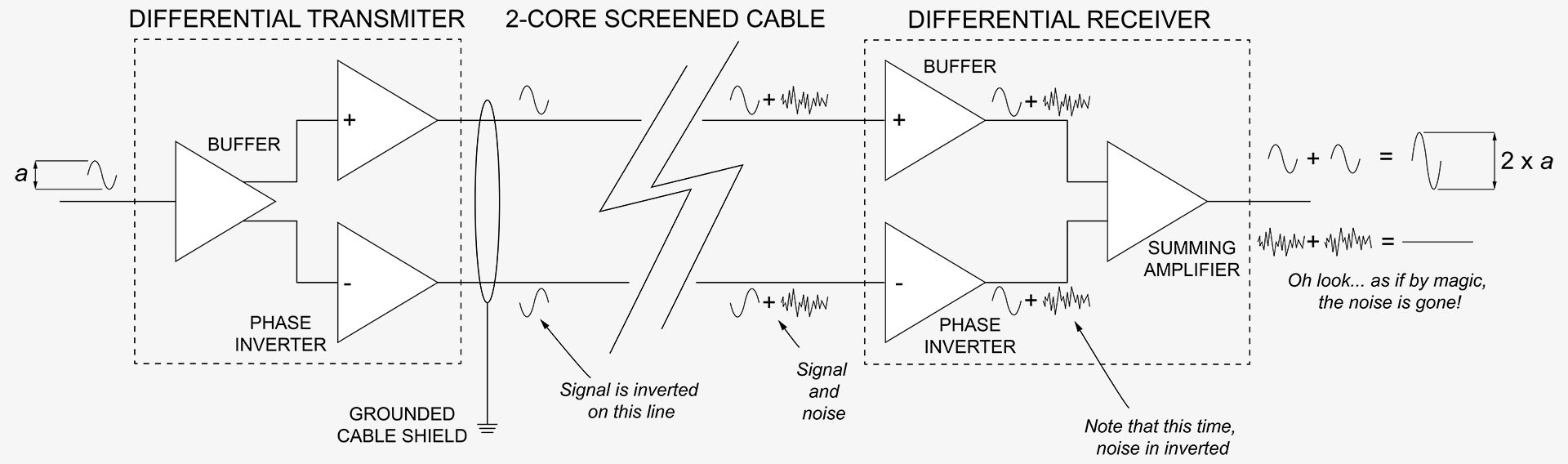 The receiver takes both non-inverted and inverted signals. The non-inverted signal passes though a buffer but just like in the sending device, the inverted signal is inverted again, putting it back in phase with the original signal. Oh but wait a minute… the noise on that line is also inverted and is now 180° out of phase to the noise on the other line.