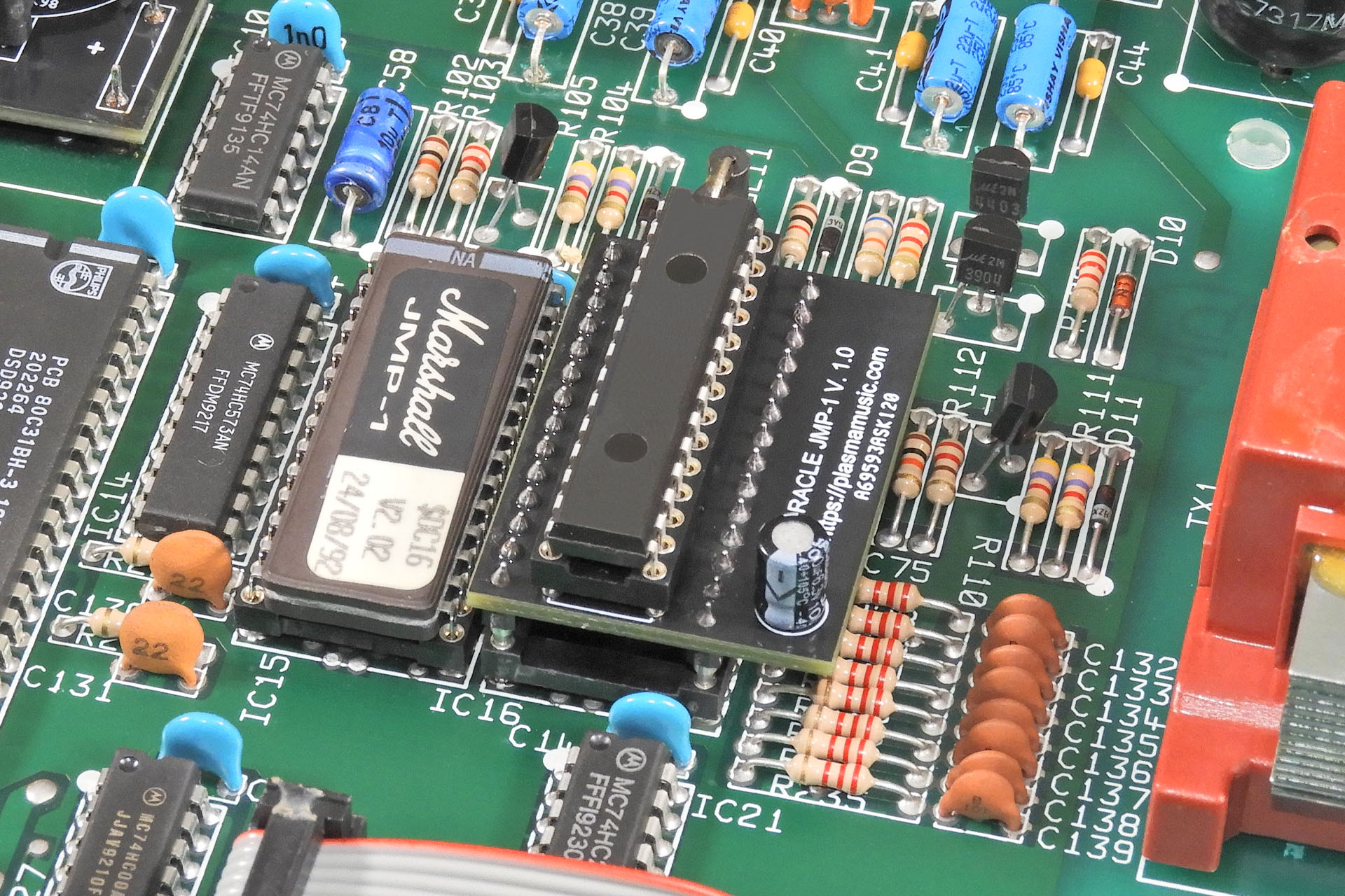 Okay, so it's not magic. At the heart of my Oracle battery eliminator for the Marshall JMP-1, is an IC that uses something called quantum trap technology (well, perhaps it is magic). Fundamentally there are two parts to the IC; a conventional static RAM (SRAM) like the original Hyundai Hy6264) and an Electrically Erasable Programable Random Access Memory (EEPROM). When switched on, the SRAM fires up and reads and writes data as one would expect, like nothing's really changed. The data that's in the SRAM however, can be written into the EEPROM. This is done by one of two methods; either in software or by specific hardware configuration, the latter of which has a two or three options. Well, I wasn't going to try rewriting the JMP-1's firmware so the autosave hardware configuration seemed to be the obvious way to go. Oracle JMP-1 is set up to retain memory when your JMP-1 is switched off. Isn't that just so cool?!?!?