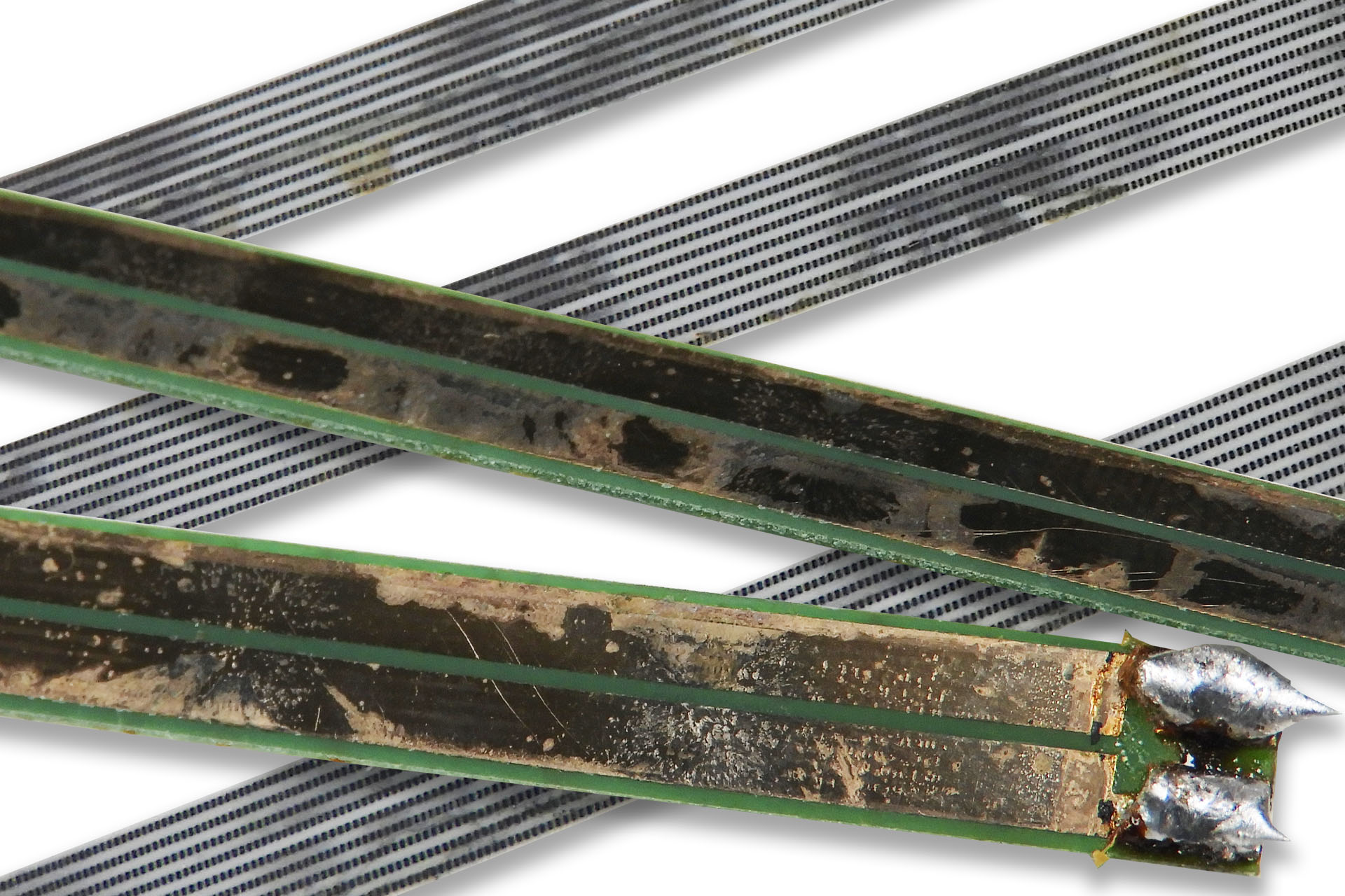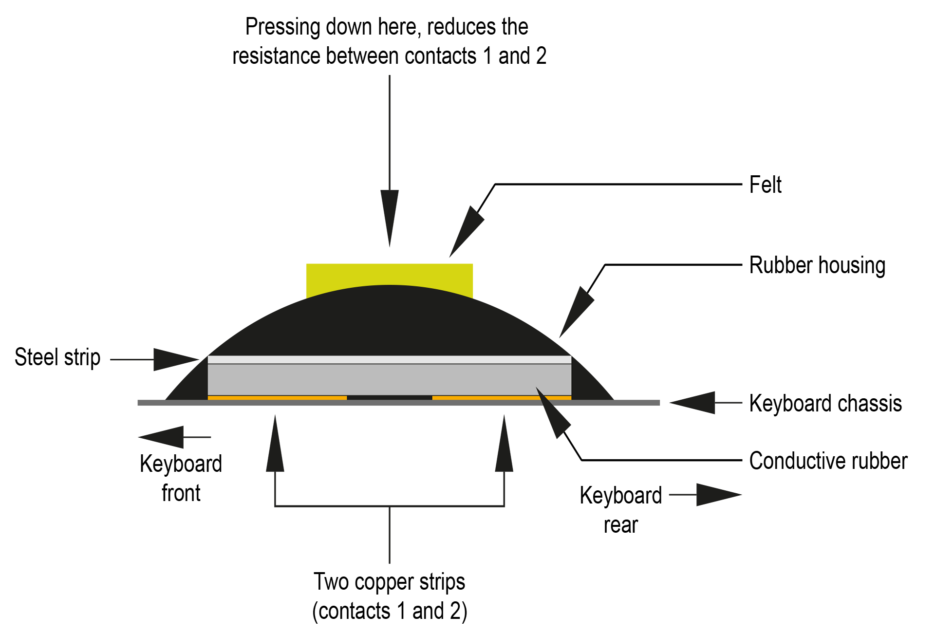 When pressing down on the aftertouch sensor, the top metal (steel) strip compresses the conductive rubber strips, thereby reducing the resistance between the bottom copper tracks. Not being hermetically sealed, the copper tracks are susceptible to oxidation and the ingress of contaminants. Over time, a layer of 'crap' develops on top of the bottom copper tracks and it doesn't matter how conductive the rubber strips are, increasing resistance between the tracks will inhibit any conduction of electricity. Don't forget that the stuff that's built up on top of the tracks, also stains the bottom of the conductive rubber strips, also reducing their ability to conduct properly. The sensitivity of the transducer deteriorates, sometimes quite quickly and the system eventually just dies. 🙁