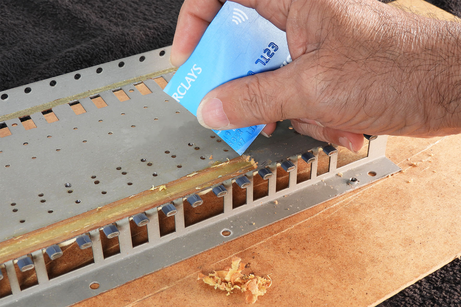 Although I didn't find a shortcut to getting rid of the old Roland glue, when I installed my second replacement JX-8P aftertouch sensor, I decided to use the cut edge of an old credit card. Yeah, I know but they do come in really handy. Clearing a millimetre of glue at a time, the process was just as tedious so you're still going to need the coffee and biscuits but... it was a lot less messy and one could argue that with less clearing up to do afterwards, it was a little quicker.