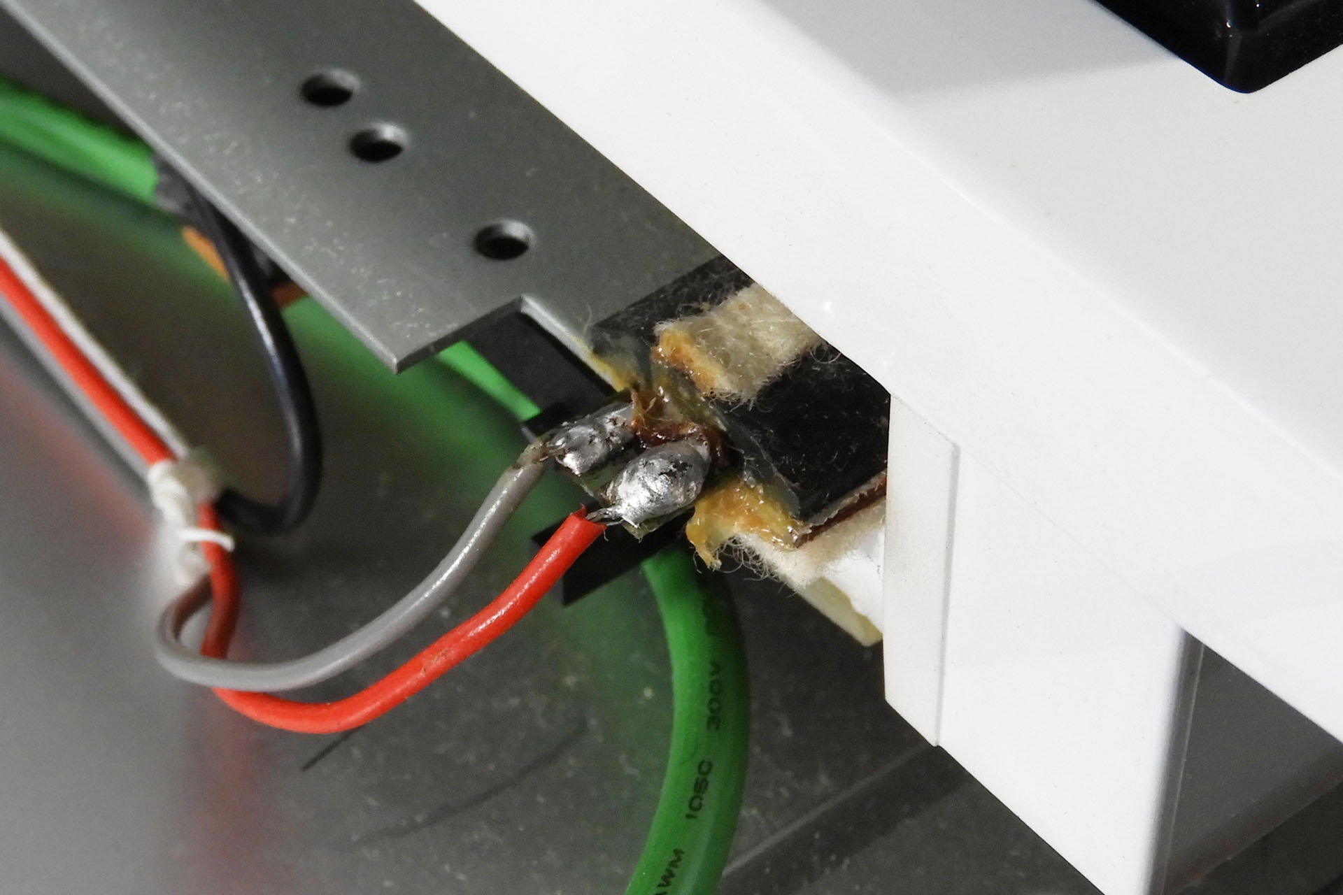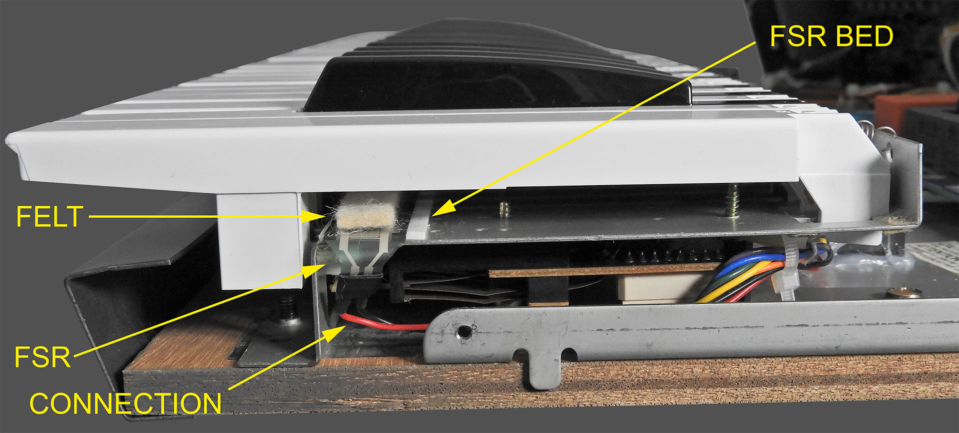 The original Roland sensor is a single device with terminals on the left-hand side. I used two FSRs and the right-hand FSR terminals would somehow have to be folded and connected. Of course, there’s very little room between the right side of the keyboard chassis and the inside of the right cheek, for example. “Not a problem” I thought. “With so much space underneath the keyboard chassis, I’ll just run my connecting wires there”… I thought.