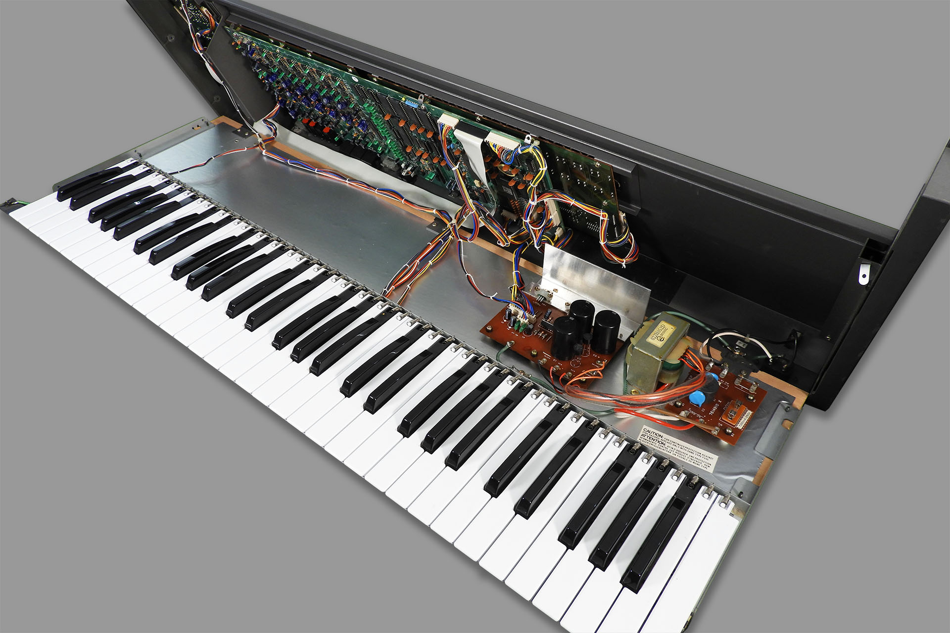 Opening the JX-8P requires the removal of three screws on each end cheek and two screws from underneath the instrument, towards the pitch-bend assembly. In the rather familiar but still elegant manner and indeed similar to many eighties keyboards, the top chassis folds up and back as it's hinged at the rear of the instrument, to the wooden base.