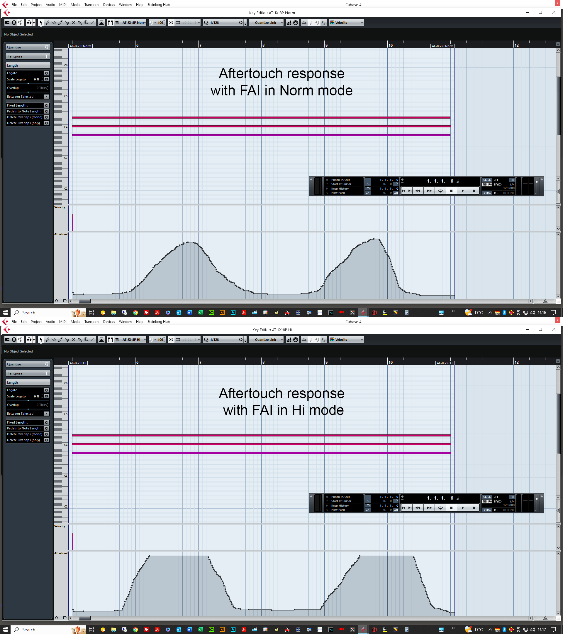 Testing the two settings with the aftertouch slider on the front panel of the JX-8P at about 80% and a nominal finger pressure (nothing heavy), I recorded a couple of hits into Cubase.