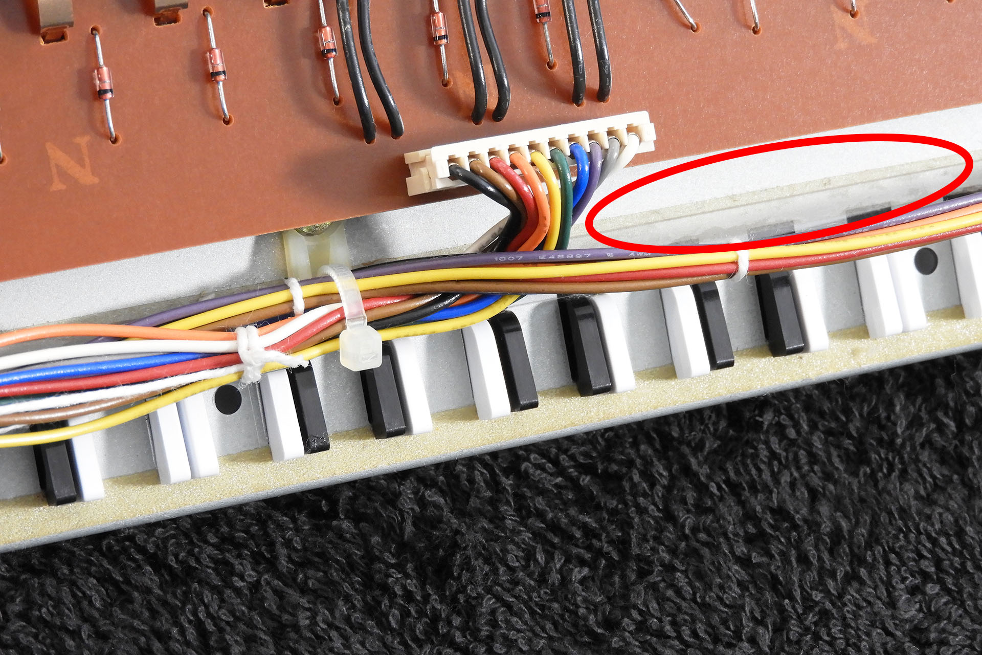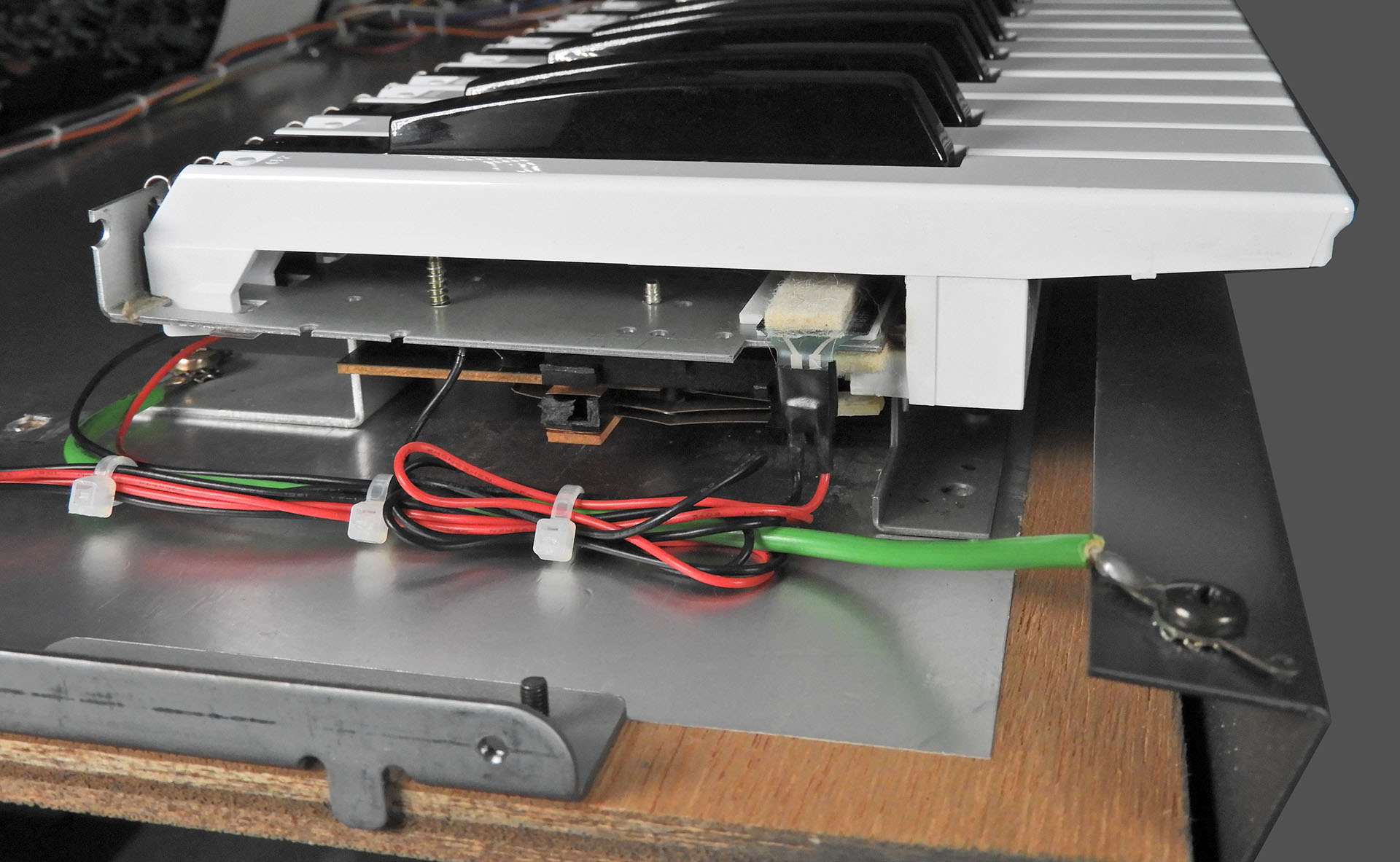 Well, for starters, right underneath the front of the keys and underneath the keyboard chassis is a small felt strip which does the same job as the felt strip on top of the aftertouch sensor; it dampens any mechanical key-noise but when the keys are released and not when they’re depressed. I definitely didn’t want to obstruct that. You can just make out the felt strip at the bottom-centre, in the two pictures above.