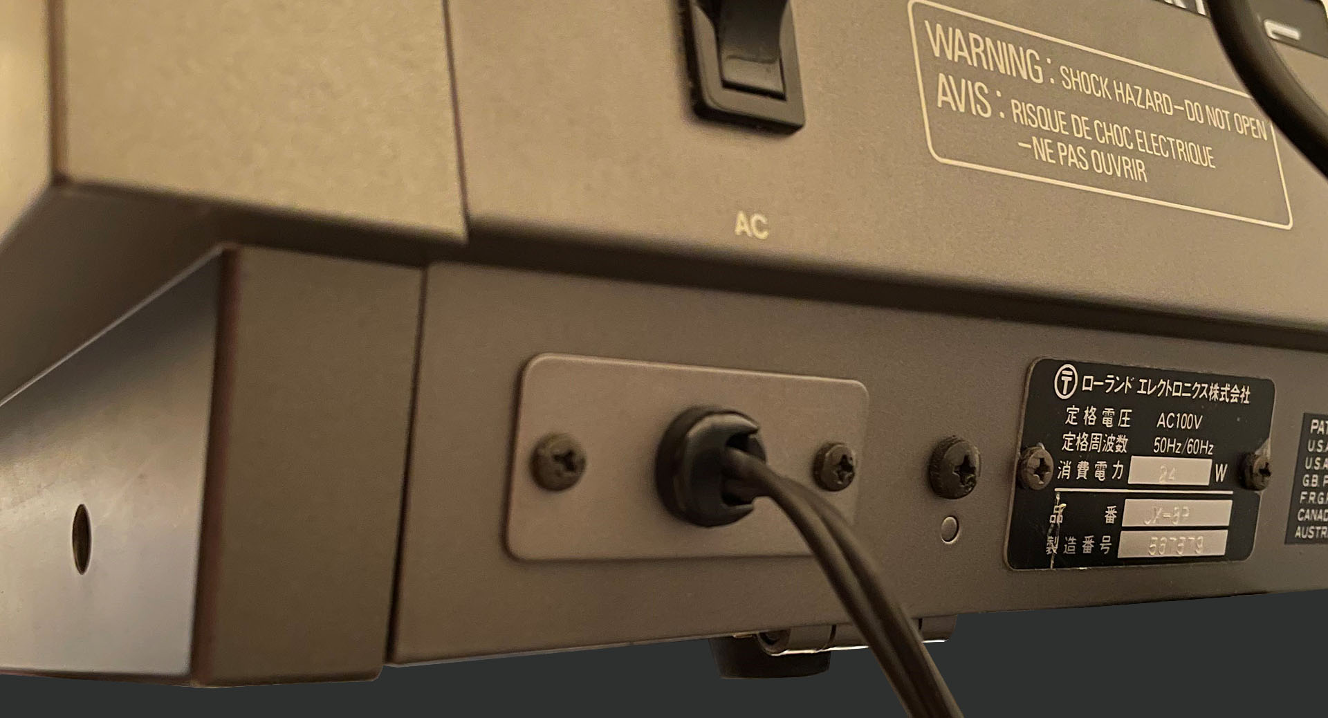 Many JX-8Ps made in the eighties were fitted with an IEC C10 2-pin power input socket. Some even had an integral power lead. These MUST be removed and replaced with a 3-pin IEC C14 power socket and the JX-8P MUST be earthed. When purchasing the P0004, I offer am 'earth bonding kit' which includes a C14 connector.