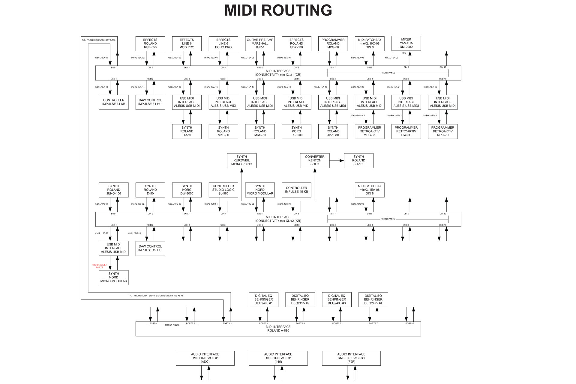 I have a Studio Logic SL-990 88-note keyboard going into the input of DIN 4 and a Kurzweil Micro Piano connected to the output of DIN 4. Similarly, I have a Novation Impulse 49 keyboard connected to the input port of DIN 6 and a Roland SH-101 connected (via a Kenton Solo) to the output port of DIN 6. I have had to name DIN 4 ‘SL-990 / Piano’ and DIN 6, ‘Imp 49 KB / SH-101’. Yeah, I know, not too much of a big deal but annoying, non-the-less. Everything works just fine of course but it would have been tidy to be able to separate the input and output devices.