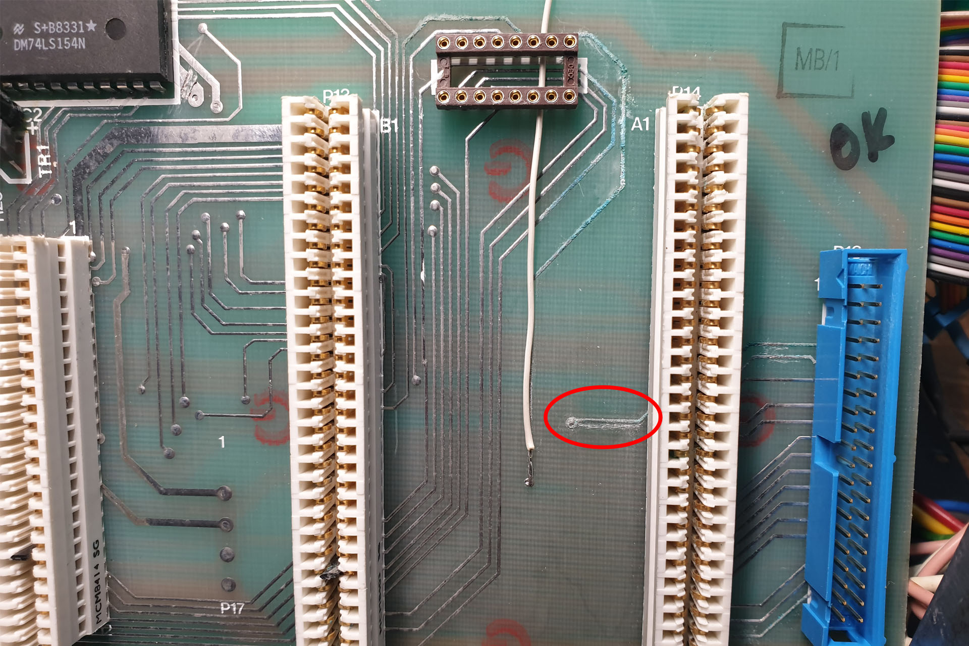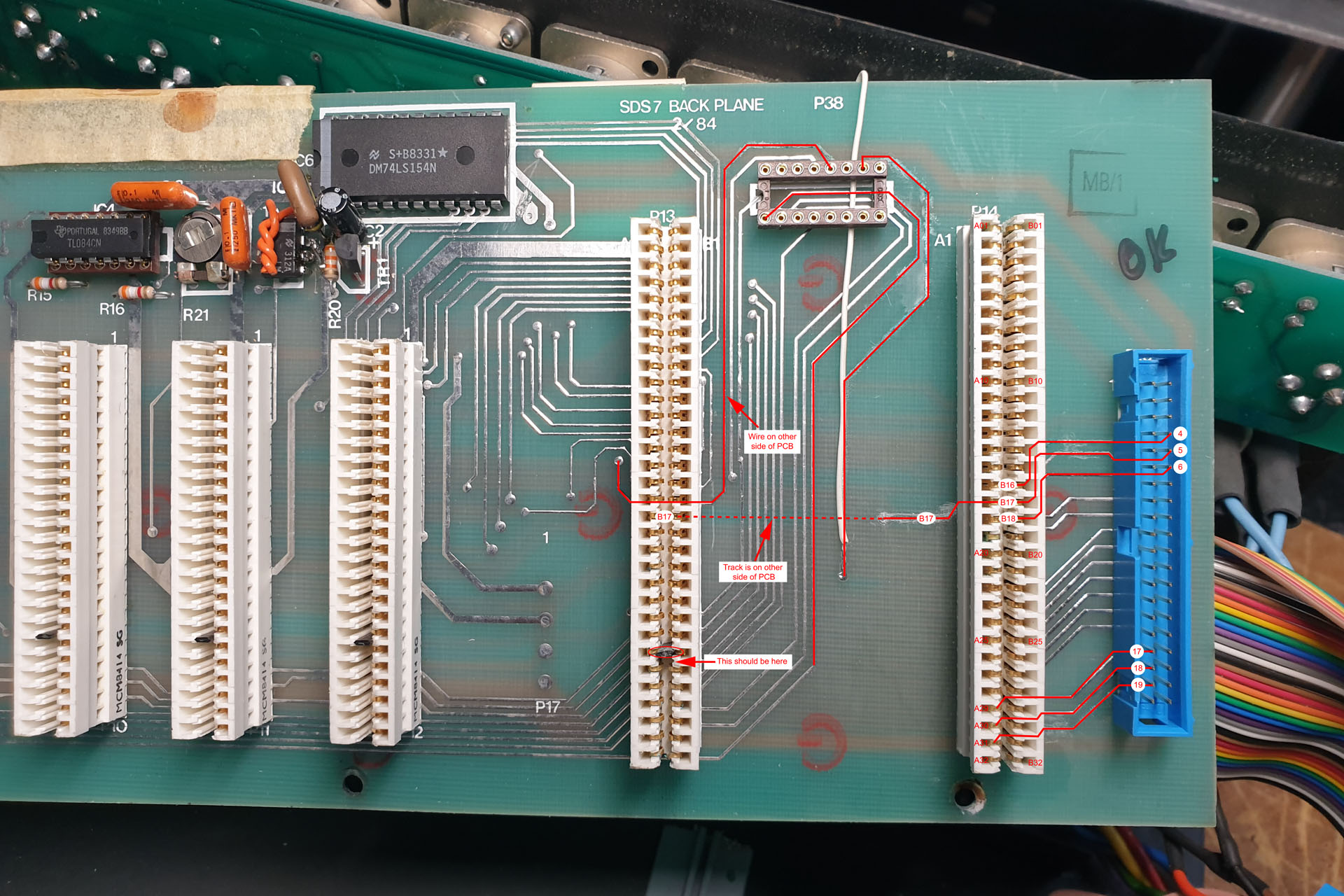 There was also, a fair bit of damage to tracks on the rear buss-board (marked up as 'SDS7 BACK PLANE'), which couldn't be resolved by cleaning alone and which required some hot-wiring. Annoying but to be expected.