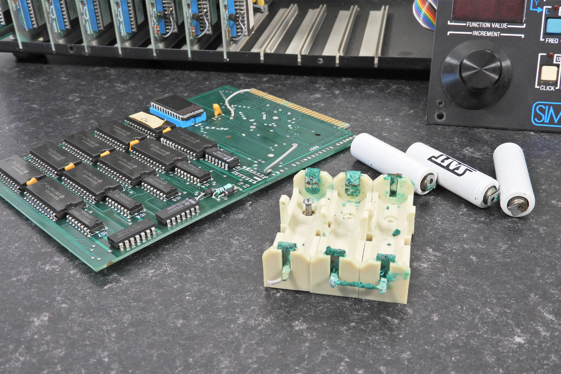 Fortunately, the Simmons SDS7 was built with vertically mounted PCBs. Despite the fact however, that there was also a version (like this one) which, instead of having a single battery soldered directly to the memory-board, used a triple AA battery holder (3 x 1.2V in series = 3.6V), battery acid managed to leak out over those already old solder joints, tracks and components. I soon noticed for example, that the C̅E̅ line was down and in fact there were several other issues preventing code from running and therefore not allowing the machine to boot.