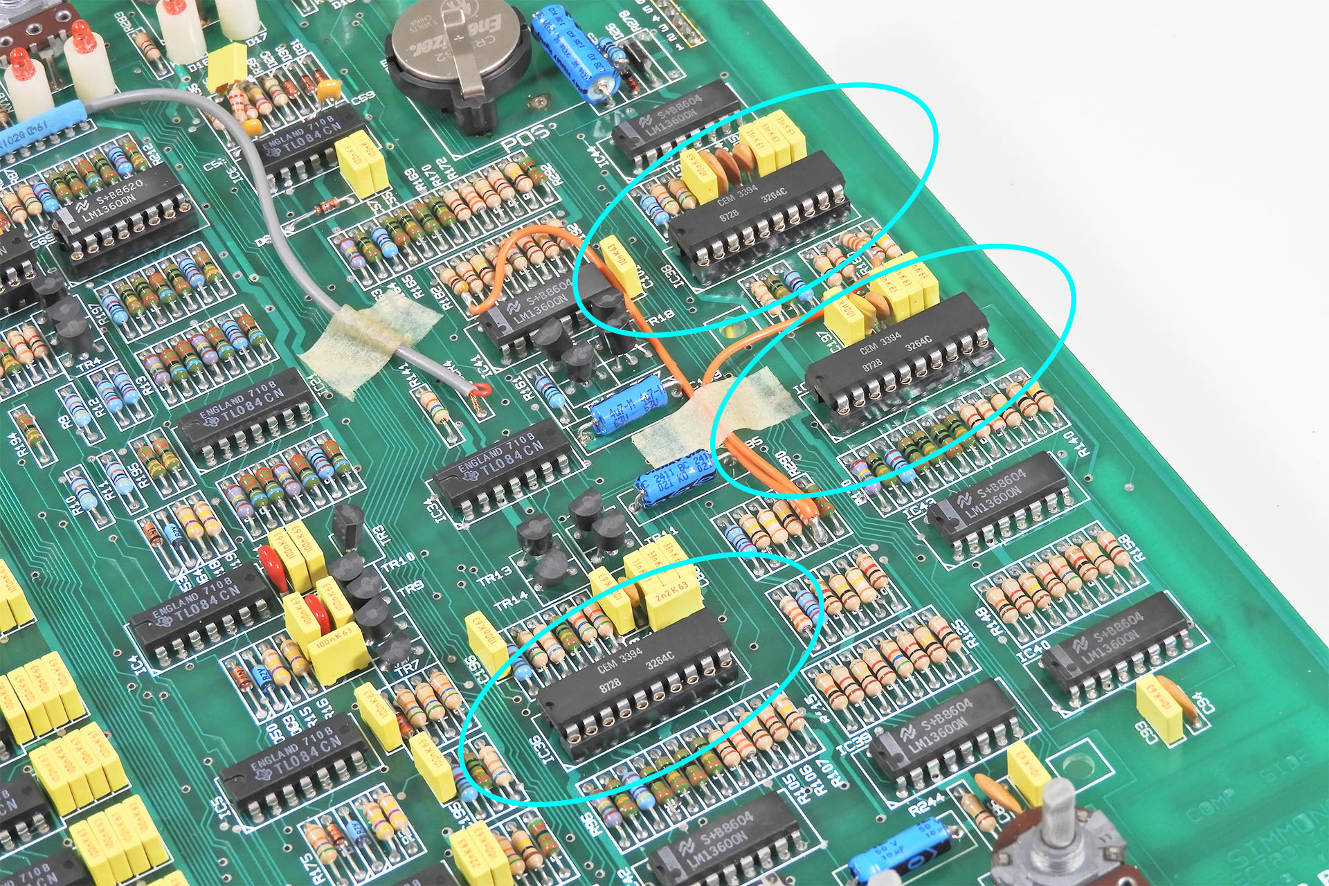 Each of the SDS9 tom signals passes through a CEM 3394 and it was common practice to socket these ICs. This was good because I was able to swap them around and quickly eliminate them as the cause of the high and mid tom issues. I was now able to focus my efforts further upstream.