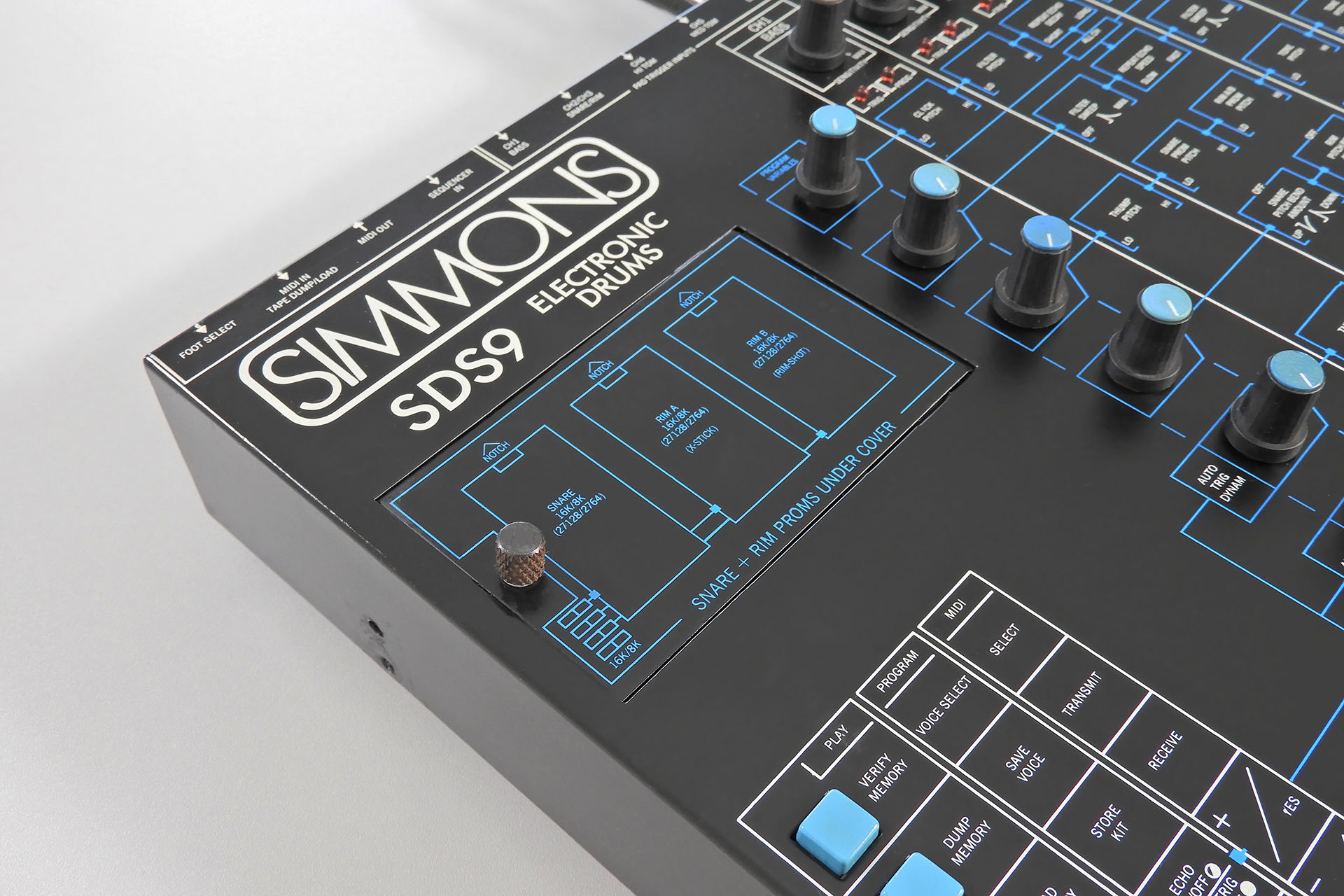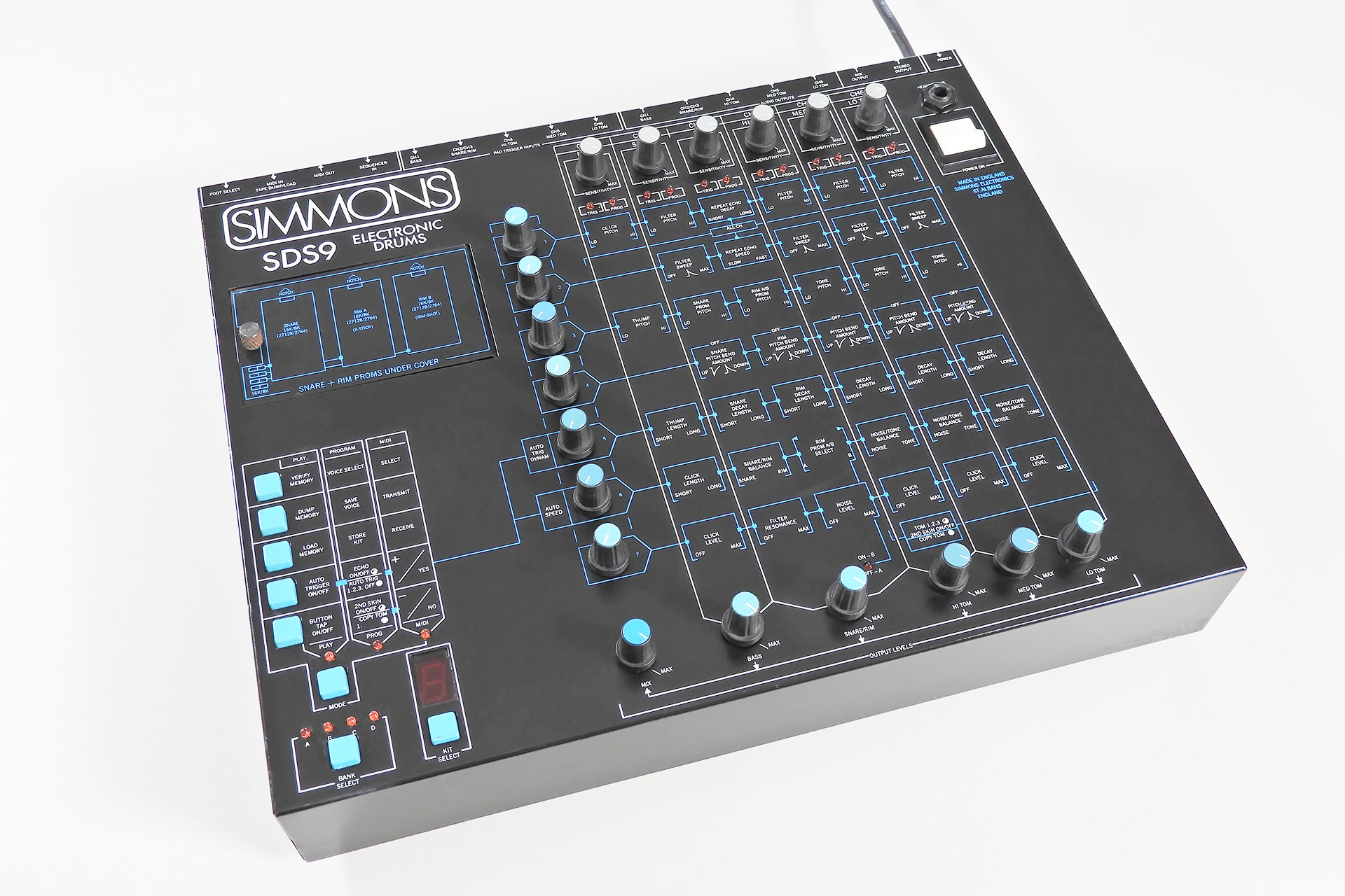 SDS9 die-hards will notice that this example has blue knob caps on the volume controls as well as on the parameter controls. To the best of my knowledge, everything is original so how those knobs ended up not being grey like the pad input sensitivity controls (and like other SDS9s), I don't know.