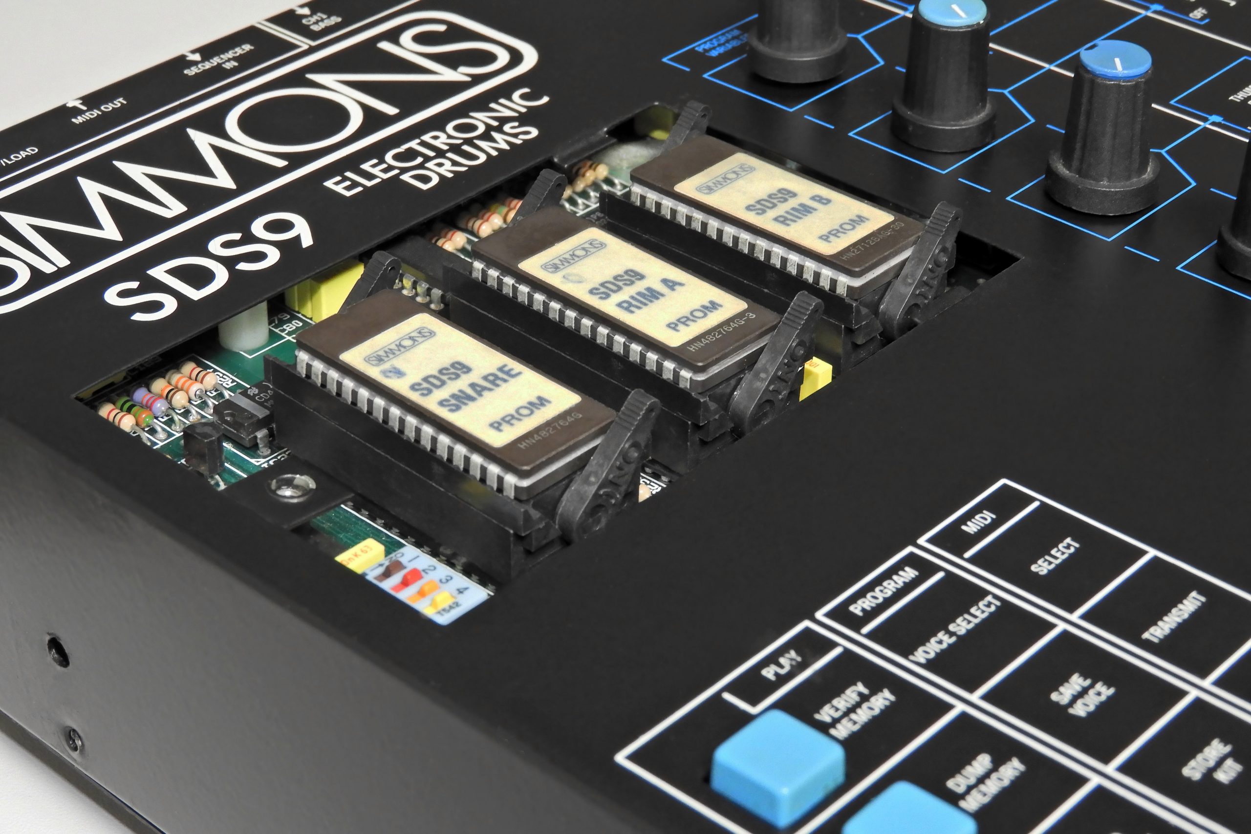 When the customer came to collect, we got talking and I mentioned how Simmons made available a ZIF socket set for the SDS9, the idea being that swapping out EPROMs would be quick and simple. It comprised three ZIF sockets and a plastic EPROM compartment cover which replaced the original steel factory cover. The replacement cover was raised so as to fit comfortably over the EPROMs.