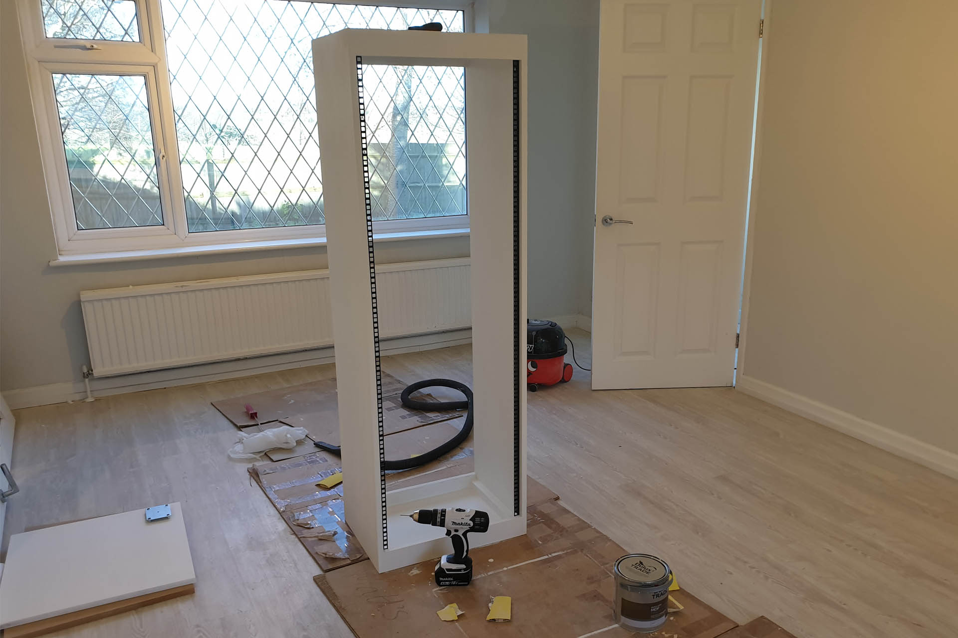 I also have to make the base-board. At 1.5m high, 400mm deep and standing as is, this enclosure would be quite unstable, so I’ve made a base using 18mm plywood, which extends beyond the front and rear of the unit and which will be fitted with castors.