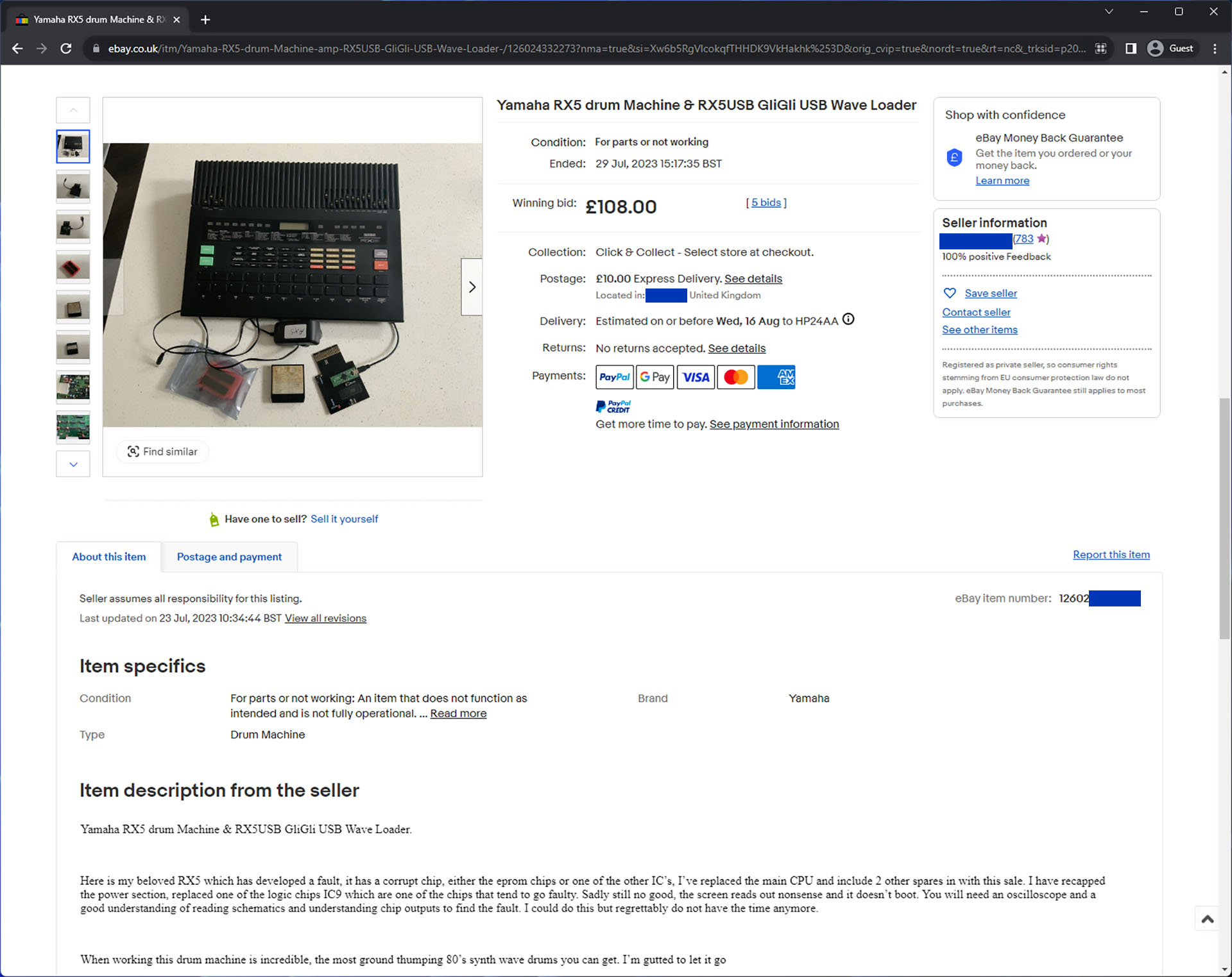So, as you do, every once in a while, I’d check out the Yamaha RX5 action at the usual on-line places. Well, a few weeks ago, a RX5 popped up. Cosmetically in great condition it did have a fault and so the auction started at 50 GBP. To cut a long story short, I ended snapping it up for 108 GBP. On top of that, collection was only twenty-five minutes away from where I live. GEEEERATE!!!!!!